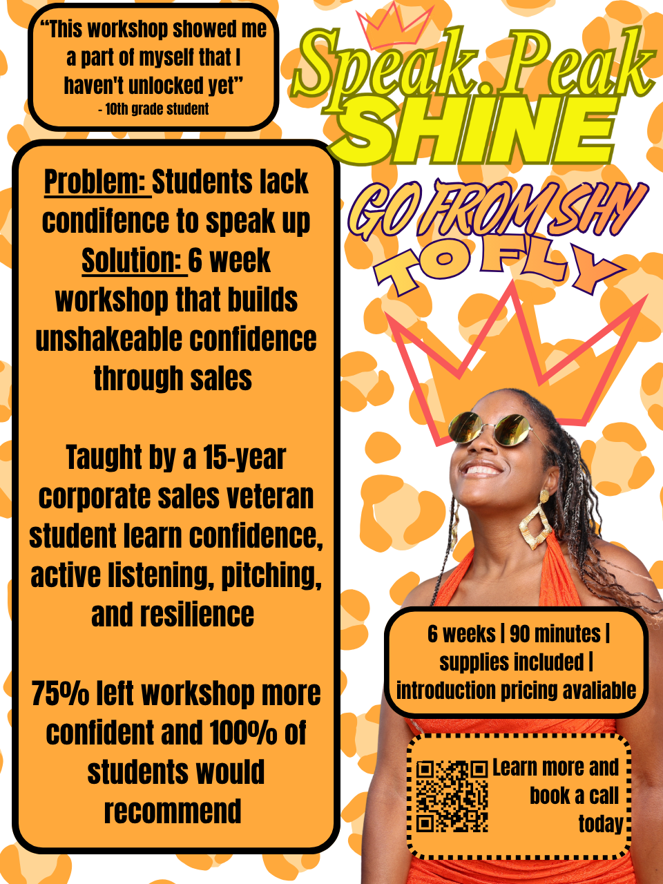 Speak Peak Shine delivers a proven 6-week curriculum that builds student confidence, public speaking skills, and an entrepreneur mindset. Designed for CTE, SEL, and afterschool programs, our workshops are highly interactive and taught by a 15-year sales veteran turned confidence coach. Students leave with practical skills they can use in interviews, college applications, and life. 100% of students recommend the program.
